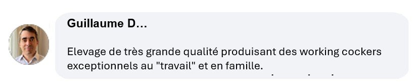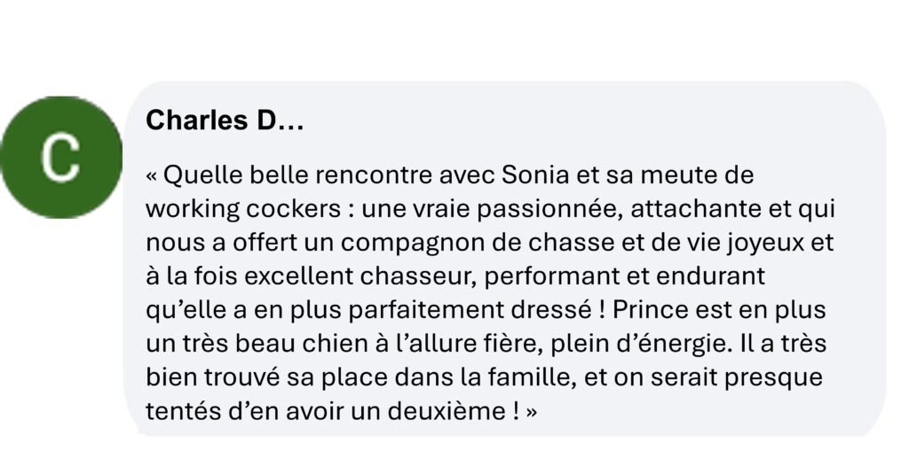 Les Working Cockers de Sonia Lévy (anciennement Guilbert) se distinguent par leurs exceptionnelles aptitudes naturelles à la chasse, fruit d’une sélection rigoureuse de géniteurs aux origines anglaises prestigieuses.